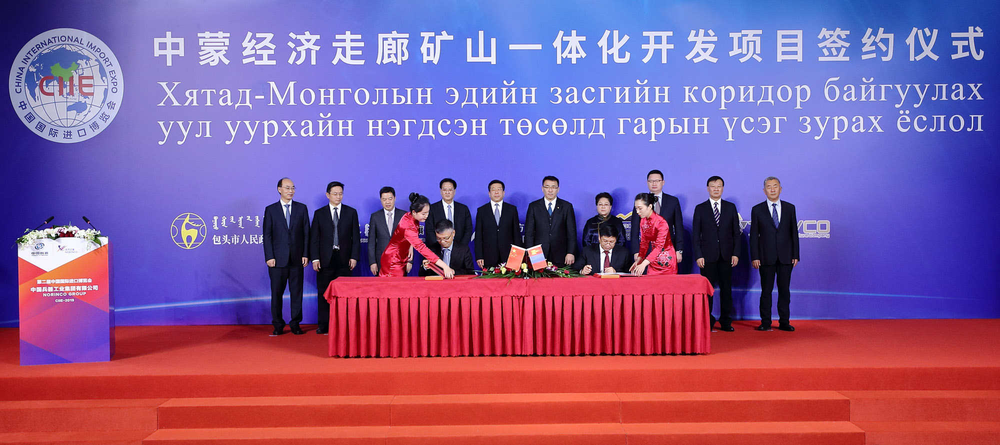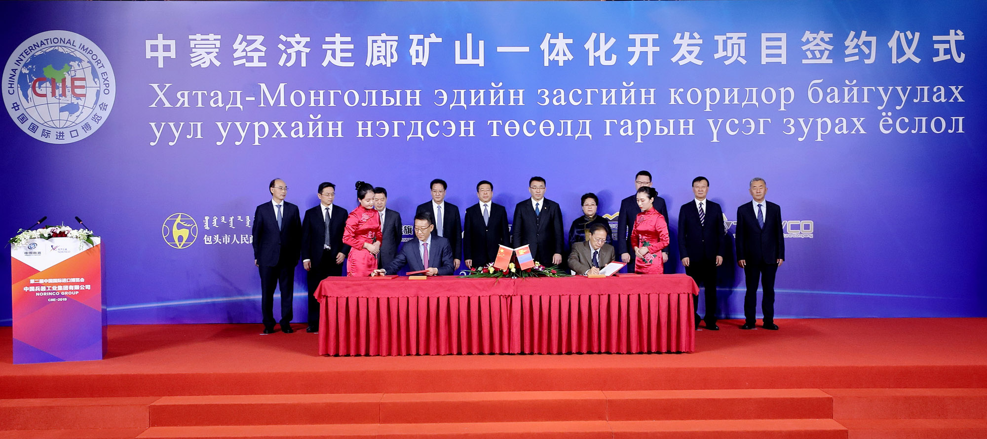 11月4日,第二屆中國國際進口博覽會開幕前,在中國兵器工業(yè)集團有限公司董事長焦開河和蒙古礦業(yè)與重工業(yè)部部長蘇米亞巴扎爾·道古蘇仁、國務(wù)院國資委副主任任洪斌、內(nèi)蒙古自治區(qū)副主席艾麗華的共同見證下,中蒙經(jīng)濟走廊礦山一體化項目在上海簽約。簽約前,各相關(guān)方進行了友好會談。