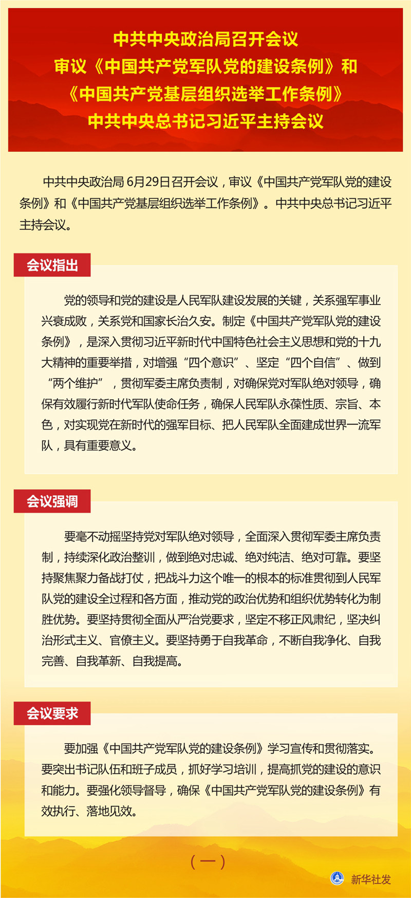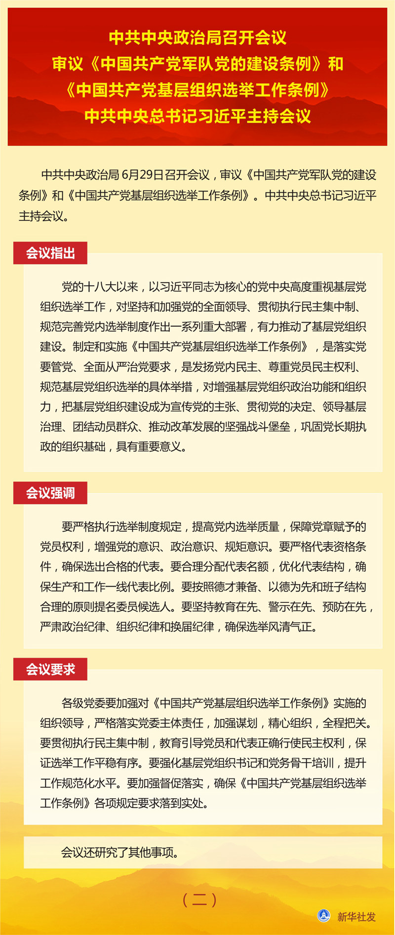 新華社北京6月29日電  中共中央政治局6月29日召開會議,審議《中國共產(chǎn)黨軍隊黨的建設(shè)條例》和《中國共產(chǎn)黨基層組織選舉工作條例》。中共中央總書記習近平主持會議。