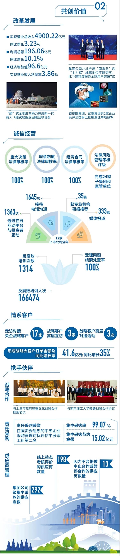 近日,國務(wù)院國資委在京舉辦“責(zé)任創(chuàng)造價(jià)值,責(zé)任引領(lǐng)未來——中央企業(yè)社會(huì)責(zé)任報(bào)告集中發(fā)布活動(dòng)(2021)”,來自中央企業(yè)的92份《報(bào)告》向公眾全面展示央企認(rèn)真履行社會(huì)責(zé)任的成果。兵器工業(yè)集團(tuán)參加集中發(fā)布活動(dòng),并向社會(huì)公眾正式發(fā)布第十二份年度社會(huì)責(zé)任報(bào)告——《中國兵器工業(yè)集團(tuán)有限公司2020年社會(huì)責(zé)任報(bào)告》,全面披露2020年度集團(tuán)公司履責(zé)實(shí)踐和履責(zé)成效。會(huì)上發(fā)布了《中央企業(yè)社會(huì)責(zé)任藍(lán)皮書(2021)》,《中國兵器工業(yè)集團(tuán)有限公司:內(nèi)化于心外化于行,打造央企責(zé)任管理表率》成功入選典型案例。 2020年,是“十三五”規(guī)劃收官之年,也是全面建成小康社會(huì)、實(shí)現(xiàn)第一個(gè)百年目標(biāo)的決勝之年。集團(tuán)公司黨組書記、董事長焦開河在報(bào)告開篇指出,集團(tuán)公司實(shí)現(xiàn)了“十三五”圓滿收官,整體步入了高質(zhì)量發(fā)展軌道,呈現(xiàn)出基礎(chǔ)更牢、動(dòng)力更強(qiáng)、空間更大、效能更高的積極向上良好態(tài)勢。在“十三五”特別是近三年來的工作實(shí)踐中,我們明確了“集團(tuán)公司是國家安全和國防建設(shè)的脊梁、是國家戰(zhàn)略科技力量最為重要的組成部分、是黨和國家最可信賴的‘六個(gè)力量’,肩負(fù)著支撐國防軍隊(duì)建設(shè)、推動(dòng)科技自立自強(qiáng)、服務(wù)構(gòu)建新發(fā)展格局的重大政治責(zé)任和光榮使命,具有極強(qiáng)的政治屬性,性質(zhì)特殊、使命特殊、責(zé)任特殊”的新時(shí)代新階段職責(zé)使命,深化了對“堅(jiān)持以習(xí)近平新時(shí)代中國特色社會(huì)主義思想定向領(lǐng)航,是集團(tuán)公司高質(zhì)量發(fā)展的根本遵循;保持貫徹落實(shí)習(xí)近平總書記重要指示批示和黨中央決策部署的戰(zhàn)略定力,是集團(tuán)公司高質(zhì)量發(fā)展的根本前提;履行好強(qiáng)軍這個(gè)首要職責(zé),是集團(tuán)公司高質(zhì)量發(fā)展的根本要求;加快兵器科技創(chuàng)新突破,是集團(tuán)公司高質(zhì)量發(fā)展的根本支撐;加強(qiáng)黨的領(lǐng)導(dǎo)黨的建設(shè),是集團(tuán)公司高質(zhì)量發(fā)展的根本保證”的兵器工業(yè)改革發(fā)展規(guī)律認(rèn)識(shí)。 《報(bào)告》聚焦“抗疫斗爭中的‘兵器力量’”,生動(dòng)展示了集團(tuán)公司抗擊疫情的有力行動(dòng),展現(xiàn)了集中力量辦大事、急國家之所急的“兵器速度”,彰顯了“把一切獻(xiàn)給黨”的人民兵工精神和貫徹落實(shí)國家決策部署的責(zé)任擔(dān)當(dāng)?!秷?bào)告》以“用心守候和平、用情溫暖社會(huì)”為主題,從恪守本責(zé)、共創(chuàng)價(jià)值、致力和諧、踐行綠色、責(zé)任管理五個(gè)維度,全面展現(xiàn)集團(tuán)公司在堅(jiān)持履行政治責(zé)任、經(jīng)濟(jì)責(zé)任、社會(huì)責(zé)任,履行強(qiáng)軍首責(zé)、加強(qiáng)黨的建設(shè)、打造國家戰(zhàn)略科技力量、推進(jìn)“一帶一路”倡議、打好打贏三大攻堅(jiān)戰(zhàn)、深化改革、助力員工成長、支持社會(huì)公益事業(yè)、提升社會(huì)責(zé)任管理等方面的生動(dòng)實(shí)踐和履責(zé)亮點(diǎn),凸顯集團(tuán)公司保持貫徹落實(shí)黨中央決策部署的戰(zhàn)略定力、在聚焦主責(zé)主業(yè)、科技引領(lǐng)、國際化經(jīng)營上持續(xù)用力,為實(shí)現(xiàn)第一個(gè)百年奮斗目標(biāo)貢獻(xiàn)力量的初心與行動(dòng)?!秷?bào)告》再次獲得中國企業(yè)社會(huì)責(zé)任報(bào)告評級(jí)專家委員會(huì)“五星佳”最高評級(jí),兵器工業(yè)集團(tuán)成為軍工行業(yè)唯一連續(xù)10年獲得最高評級(jí)的企業(yè)。 2021年是開啟新征程的開局之年,也是建黨100周年、人民兵工創(chuàng)建90周年,兵器工業(yè)集團(tuán)將全面貫徹落實(shí)黨中央戰(zhàn)略部署,緊扣推動(dòng)高質(zhì)量發(fā)展主題,圍繞“十四五”開好局、起好步,堅(jiān)決完成黨中央賦予的職責(zé)使命,履行好中央企業(yè)和軍工集團(tuán)的政治責(zé)任、經(jīng)濟(jì)責(zé)任、社會(huì)責(zé)任,為實(shí)現(xiàn)中國夢強(qiáng)軍夢作出新的更大貢獻(xiàn)! 一圖看懂《中國兵器工業(yè)集團(tuán)有限公司2020年社會(huì)責(zé)任報(bào)告》 |