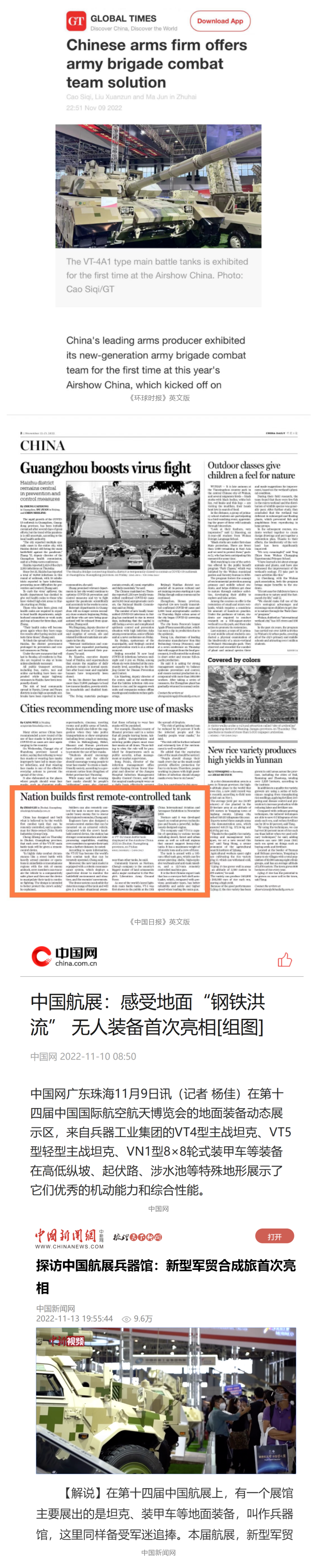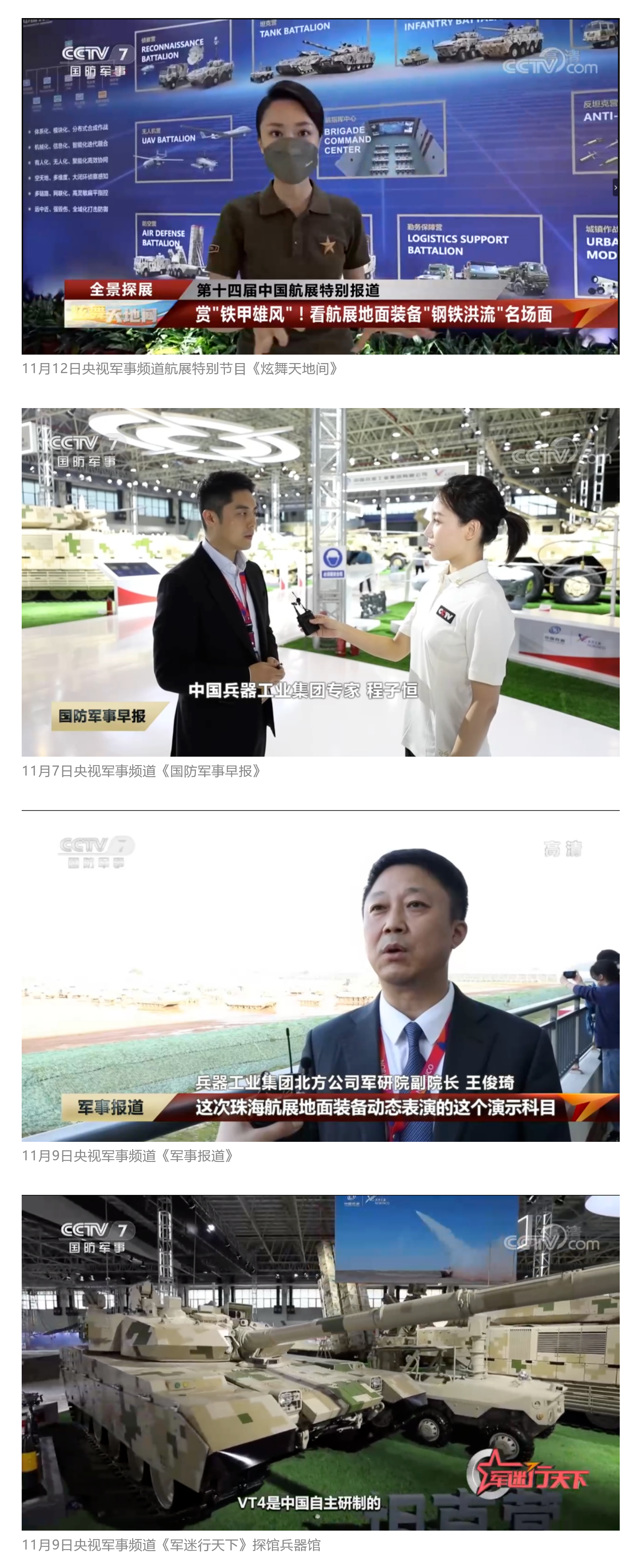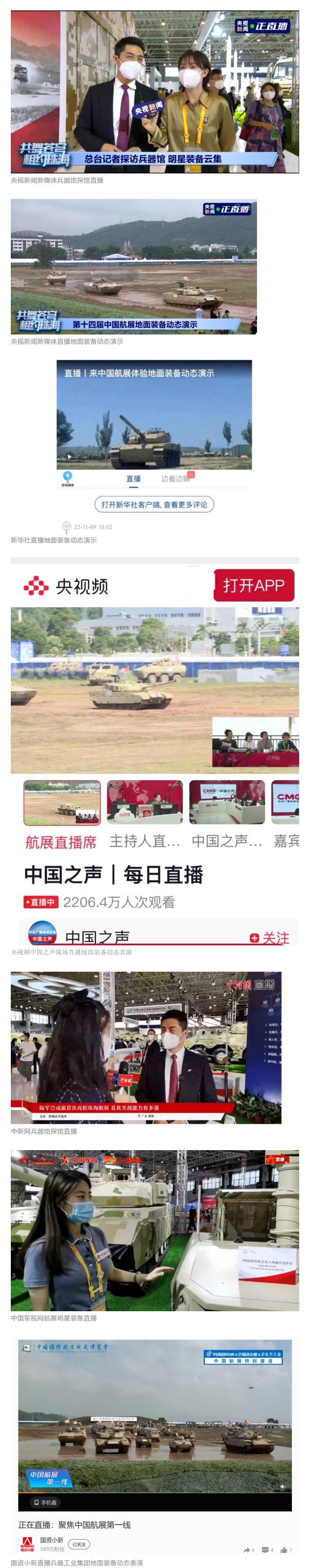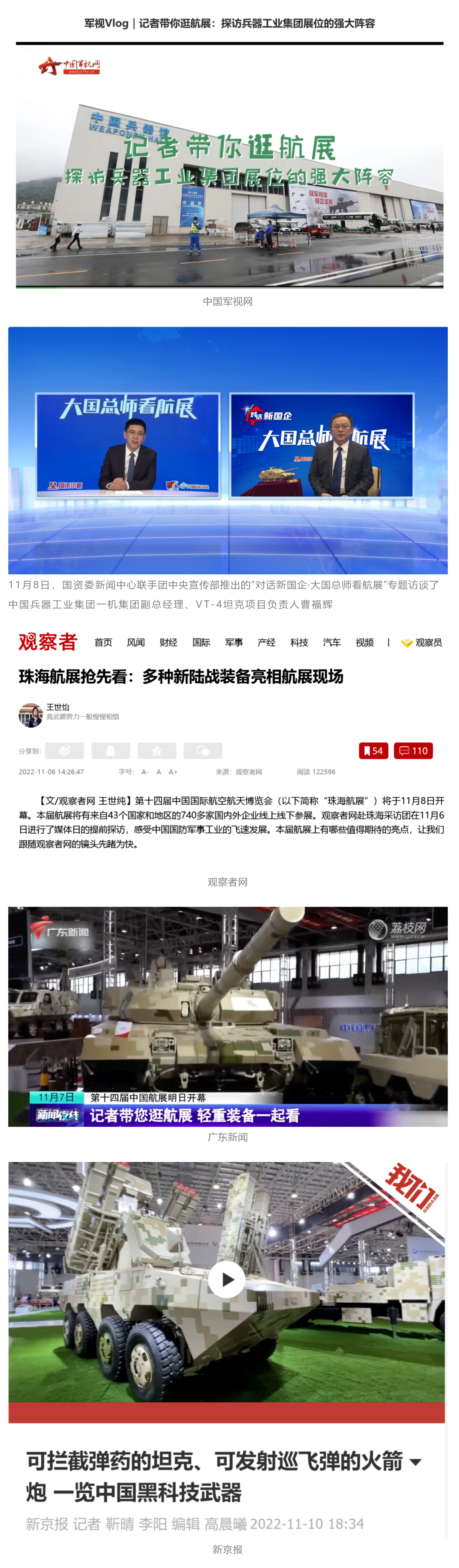 央視國防軍事頻道航展特別報道《炫舞天地間》11月12日《賞“鐵甲雄風”!看航展地面裝備“鋼鐵洪流”名場面》對兵器工業(yè)集團武器裝備特色亮點進行報道。《國防軍事早報》11月7日推出報道《第十四屆中國國際航空航天博覽會明天開幕 中國兵器館首次以陸軍合成旅實戰(zhàn)體系形式展出》,對兵器館陸軍合成旅實戰(zhàn)體系進行報道?!盾娛聢蟮馈?1月9日推出《第十四屆中國國際航空航天博覽會 地面兵器裝備首次聯(lián)合陸航直升機進行動態(tài)展示》報道?!盾娒孕刑煜隆?1月9日推出報道《軍迷打卡航展2022》以專業(yè)軍迷視角探館兵器館,全面展示兵器工業(yè)集團參展裝備特色亮點。