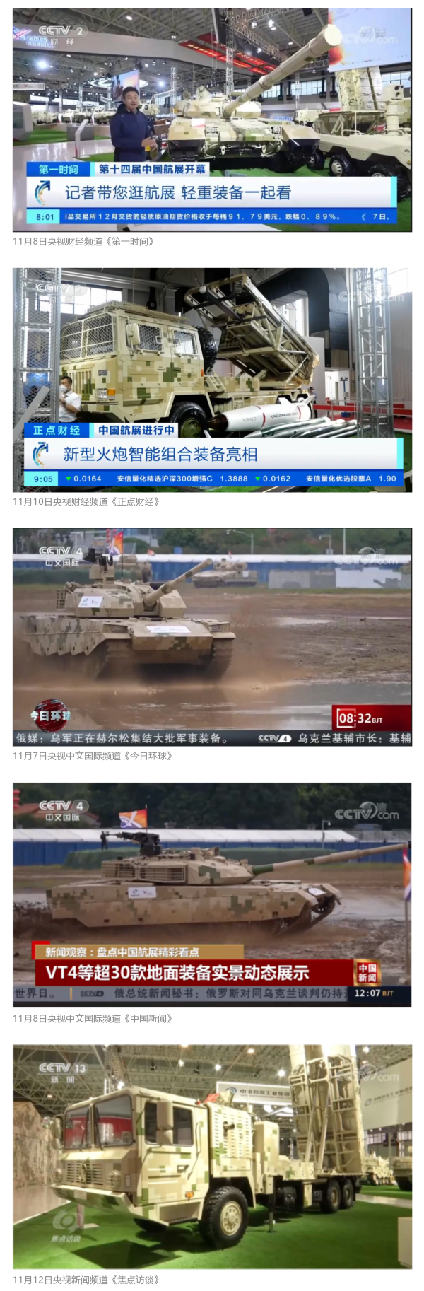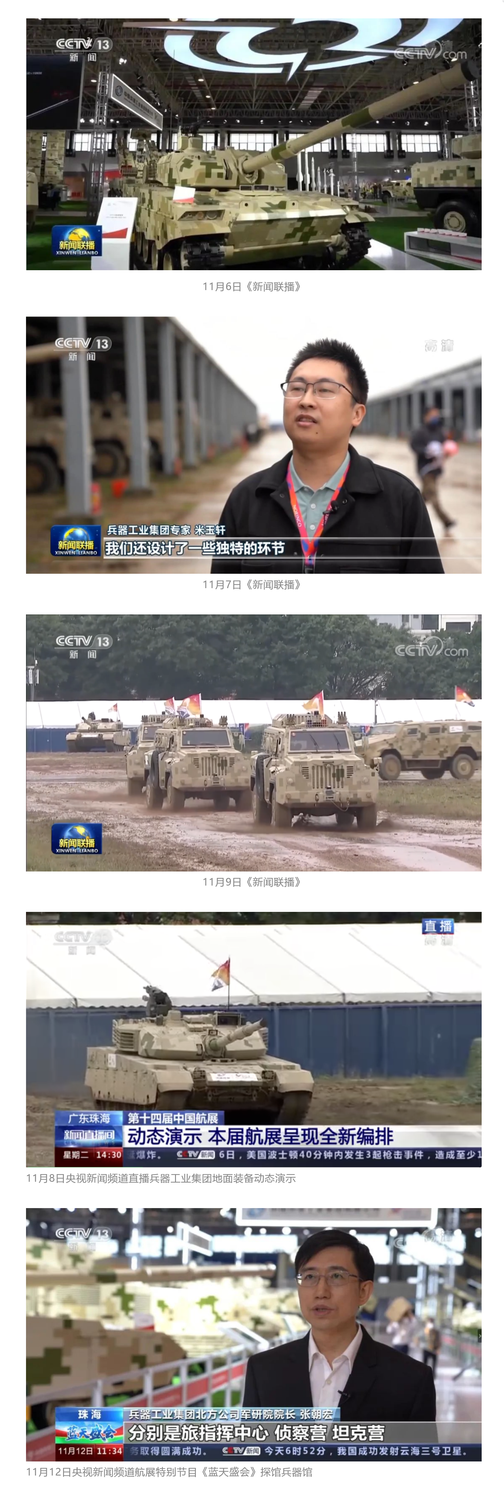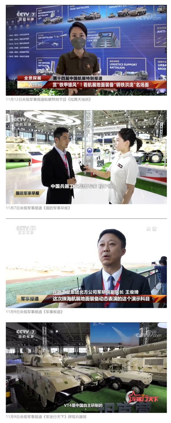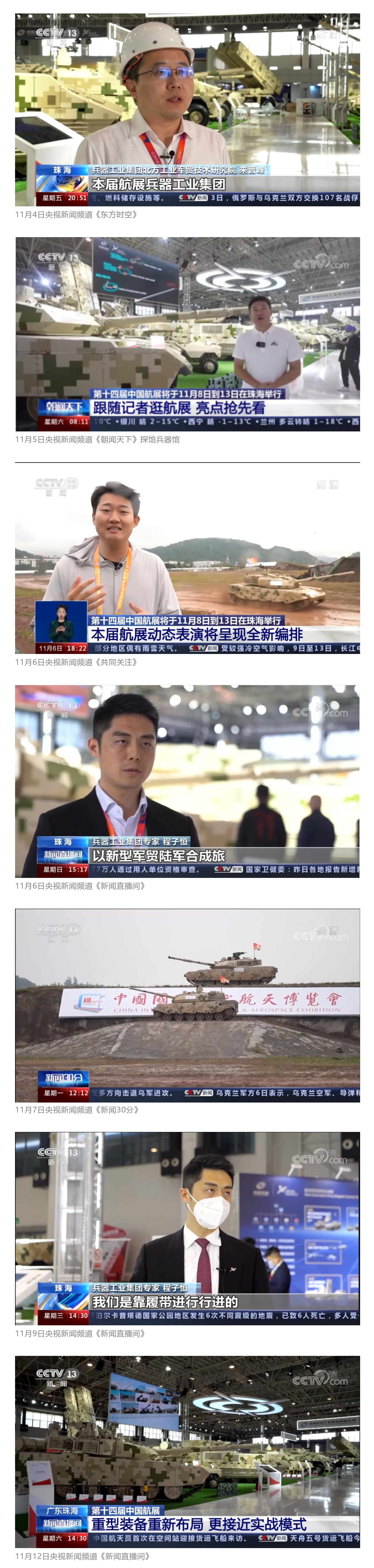 此次航展,央視新聞頻道《朝聞天下》《新聞直播間》《東方時空》《共同關注》《新聞30分》《24小時》、央視國防軍事頻道《國防軍事早報》《軍事報道》《軍迷行天下》、央視國際頻道《中國新聞》《今日環(huán)球》等欄目共播出兵器工業(yè)集團參展相關新聞報道30余條。
