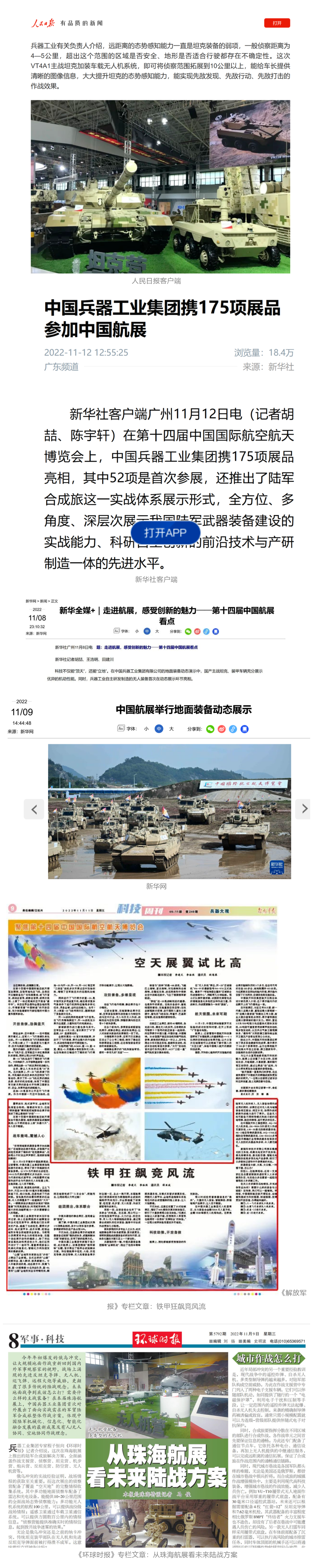 人民日報客戶端、新華社客戶端、新華網(wǎng)、央視新聞客戶端、《解放軍報》、《環(huán)球時報》、《中國日報》、中國網(wǎng)、人民網(wǎng)、中國新聞網(wǎng)、央視網(wǎng)、央廣網(wǎng)、中國軍視網(wǎng)、中國之聲,圖片中國、觀察者網(wǎng)、鳳凰網(wǎng)、新浪網(wǎng)、搜狐網(wǎng)、網(wǎng)易網(wǎng)、今日頭條等中央主流媒體和知名網(wǎng)絡媒體以及南方日報、廣東衛(wèi)視、廣東新聞、北京時間、新京報、珠海電視臺、看看新聞等省市媒體對集團公司參展情況進行了濃墨重彩的圖片、文字、視頻報道。