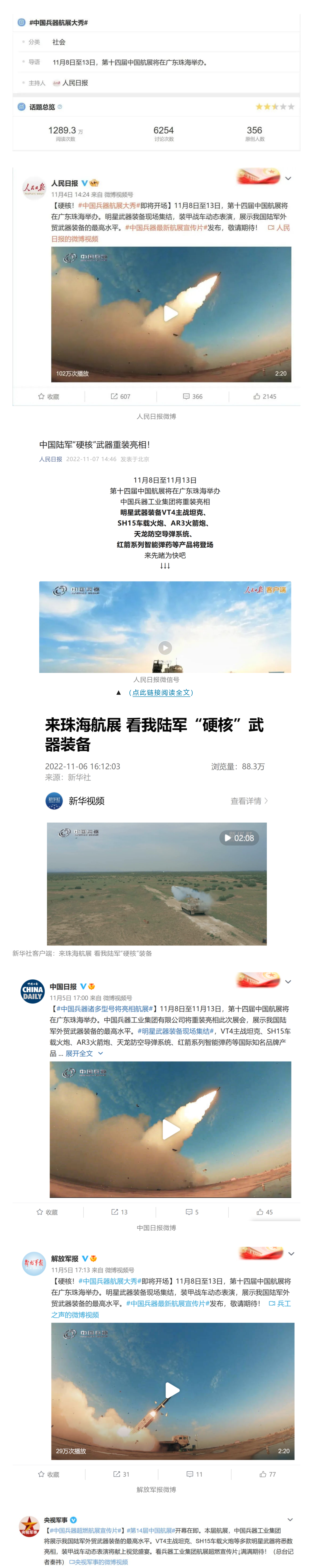 人民日報官方微博、微信公眾號,新華社客戶端、央視新聞客戶端、中國日報微博、參考消息微信公眾號、解放軍報微博、央視軍事微博、CGTN微博、中國軍號微博、共青團中央微博、環(huán)球時報(英文網(wǎng)站、臉書賬號、推特賬號)、嗶哩嗶哩、學習強國平臺、國資小新視頻號、網(wǎng)易軍事、騰訊軍事、鳳凰軍事、北京日報、東方衛(wèi)視看看新聞全媒體、北京電視臺等20余家中央主流媒體、國家部委、省市媒體的新媒體第一時間播發(fā)集團公司航展宣傳片等視頻作品燃爆全網(wǎng),累計閱讀量突破1700萬人次。集團公司微信公眾號、微博、抖音號、快手號、微信視頻號、知乎號等新媒體宣傳片播放閱讀量超過800萬人次,點贊超過30萬人次。集團公司微信公眾號推出《硬核!中國兵器最新航展宣傳片發(fā)布》《中國兵器航展節(jié)目單,請選出心中明星裝備》《航展首日,中國兵器閃耀亮相!》等7篇報道,閱讀量超過25萬人次,集團公司微信視頻號、抖音號、快手號等新媒體賬號發(fā)布“中國兵器航展大秀”系列視頻,觀看量超過330萬人次。