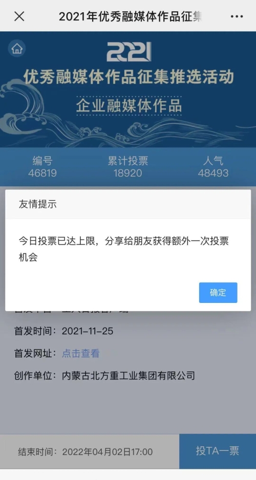 近日,由“文化強(qiáng)國(guó)”光明日?qǐng)?bào)協(xié)同推廣平臺(tái)、光明網(wǎng)、北京師范大學(xué)新媒體傳播研究中心和光明天翼5G融媒實(shí)驗(yàn)室共同主辦的“2021年優(yōu)秀融媒體作品征集推選活動(dòng)”開啟線上投票環(huán)節(jié),經(jīng)過專家委員會(huì)評(píng)審,中國(guó)兵器工業(yè)集團(tuán)北重集團(tuán)《白楊伴我獻(xiàn)國(guó)防》音樂MV入選活動(dòng)前二十名,并進(jìn)入網(wǎng)絡(luò)投票環(huán)節(jié)