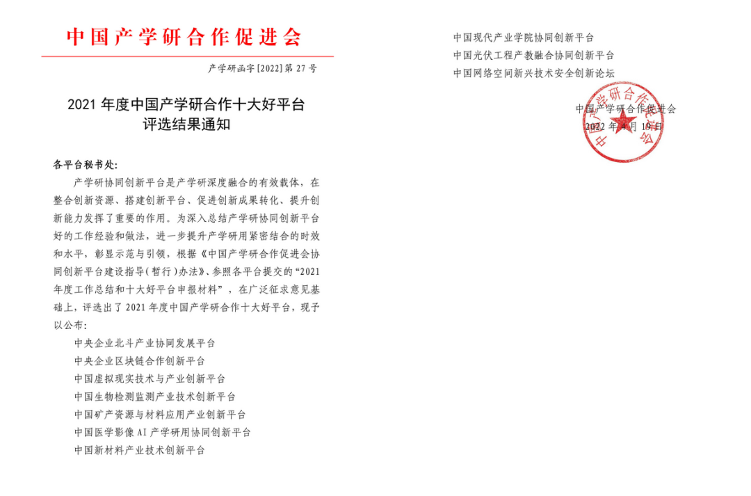 4月19日,在中國(guó)產(chǎn)學(xué)研合作促進(jìn)會(huì)主辦的2021年度產(chǎn)學(xué)研協(xié)同創(chuàng)新平臺(tái)評(píng)選工作中,中央企業(yè)北斗產(chǎn)業(yè)協(xié)同發(fā)展平臺(tái)獲評(píng)“中國(guó)產(chǎn)學(xué)研合作十大好平臺(tái)”。