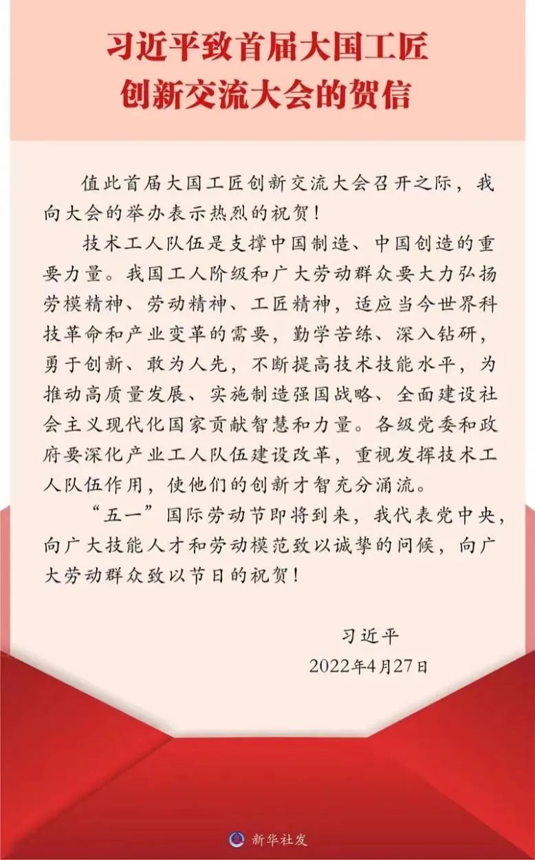2022年4月27日,由中華全國總工會(huì)主辦,廣東省總工會(huì)、深圳市人民政府、中國職工技術(shù)協(xié)會(huì)承辦,各省、自治區(qū)、直轄市和各全國產(chǎn)業(yè)工會(huì)組織所屬單位參加的首屆大國工匠創(chuàng)新交流大會(huì)(以下簡稱“大會(huì)”)在北京開幕。中共中央總書記、國家主席、中央軍委主席習(xí)近平發(fā)來賀信,向大會(huì)的舉辦表示熱烈的祝賀,并在“五一”國際勞動(dòng)節(jié)到來之際,代表黨中央向廣大技能人才和勞動(dòng)模范致以誠摯的問候,向廣大勞動(dòng)群眾致以節(jié)日的祝賀。