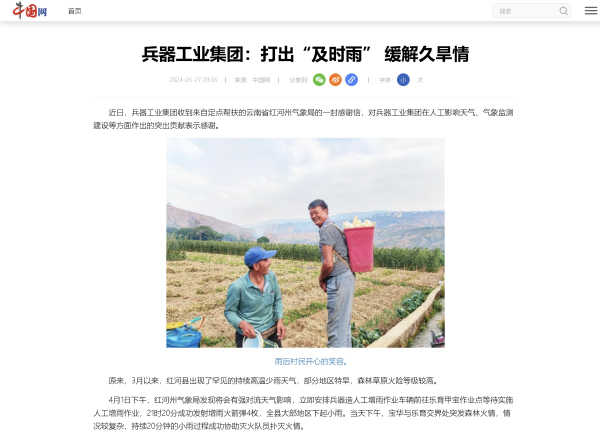 5月27日,中國網(wǎng)刊發(fā)《兵器工業(yè)集團:打出“及時雨” 緩解久旱情》,對中國兵器工業(yè)集團有限公司助力云南省紅河州人工影響天氣、氣象監(jiān)測建設等方面作出的突出貢獻作了報道。