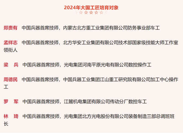 兵器工業(yè)集團(tuán)6名高技能人才入選2024年大國工匠培育對(duì)象名單
