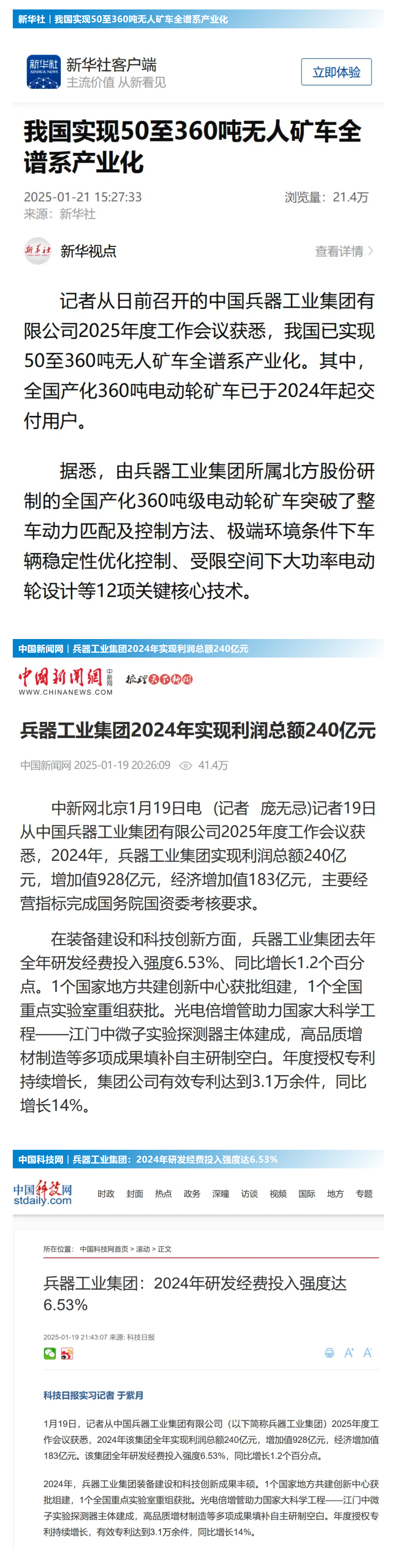 集團(tuán)公司2024年取得的成績(jī)及下一步重點(diǎn)工作受到社會(huì)媒體廣泛關(guān)注。新華社、中國(guó)新聞網(wǎng)、中國(guó)科技網(wǎng)、光明日?qǐng)?bào)客戶端、經(jīng)濟(jì)日?qǐng)?bào)客戶端、中國(guó)日?qǐng)?bào)網(wǎng)、國(guó)務(wù)院國(guó)資委網(wǎng)站、學(xué)習(xí)強(qiáng)國(guó)中央企業(yè)學(xué)習(xí)平臺(tái)、新浪網(wǎng)、網(wǎng)易網(wǎng)、搜狐網(wǎng)、騰訊網(wǎng)、鳳凰網(wǎng)等中央主流媒體、國(guó)家部委網(wǎng)站及知名網(wǎng)絡(luò)媒體對(duì)集團(tuán)公司2025年度工作會(huì)議進(jìn)行了報(bào)道,重點(diǎn)關(guān)注集團(tuán)公司經(jīng)營(yíng)業(yè)績(jī)、科技創(chuàng)新、產(chǎn)業(yè)結(jié)構(gòu)布局優(yōu)化等情況。其中,新華社以《我國(guó)實(shí)現(xiàn)50至360噸無(wú)人礦車全譜系產(chǎn)業(yè)化》為題,重點(diǎn)報(bào)道了集團(tuán)公司在推動(dòng)智能制造水平提升方面取得的成效;中國(guó)新聞網(wǎng)、光明日?qǐng)?bào)客戶端、經(jīng)濟(jì)日?qǐng)?bào)客戶端、中國(guó)日?qǐng)?bào)網(wǎng)等就集團(tuán)公司2024年度經(jīng)營(yíng)業(yè)績(jī)及各項(xiàng)工作取得的成果進(jìn)行報(bào)道;中國(guó)科技網(wǎng)著重報(bào)道了集團(tuán)公司在科技創(chuàng)新和優(yōu)化產(chǎn)業(yè)結(jié)構(gòu)布局方面的最新進(jìn)展。集團(tuán)公司門(mén)戶網(wǎng)站、微信公眾號(hào)、微博等新媒體平臺(tái)以及《中國(guó)兵工報(bào)》也對(duì)集團(tuán)公司工作會(huì)議進(jìn)行了及時(shí)報(bào)道,各成員單位紛紛對(duì)相關(guān)內(nèi)容進(jìn)行轉(zhuǎn)載,引發(fā)全系統(tǒng)關(guān)注。