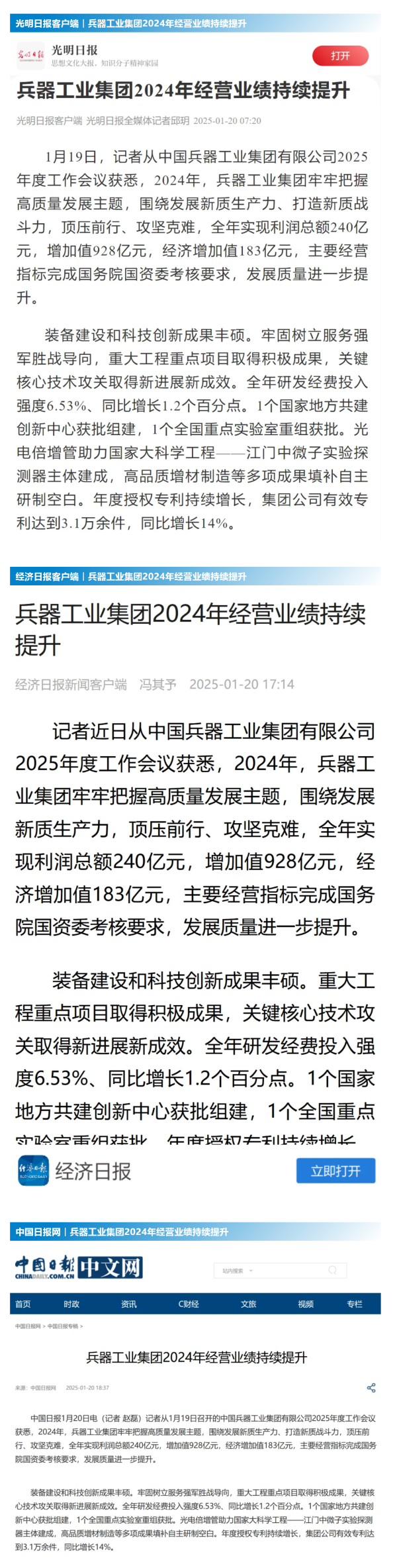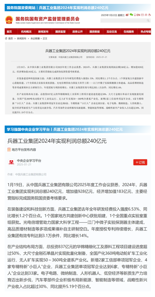 中國(guó)新聞網(wǎng):兵器工業(yè)集團(tuán)2024年實(shí)現(xiàn)利潤(rùn)總額240億元2025-01-20