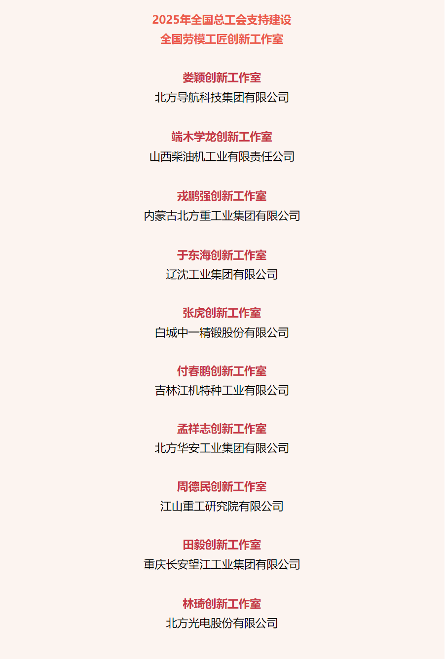 近日,中華全國總工會(huì)公布2025年全國總工會(huì)支持建設(shè)全國勞模工匠創(chuàng)新工作室名單,兵器工業(yè)集團(tuán)10個(gè)勞模工匠創(chuàng)新工作室獲全國總工會(huì)支持建設(shè)。 來源丨中華全國總工會(huì)辦公廳 |
